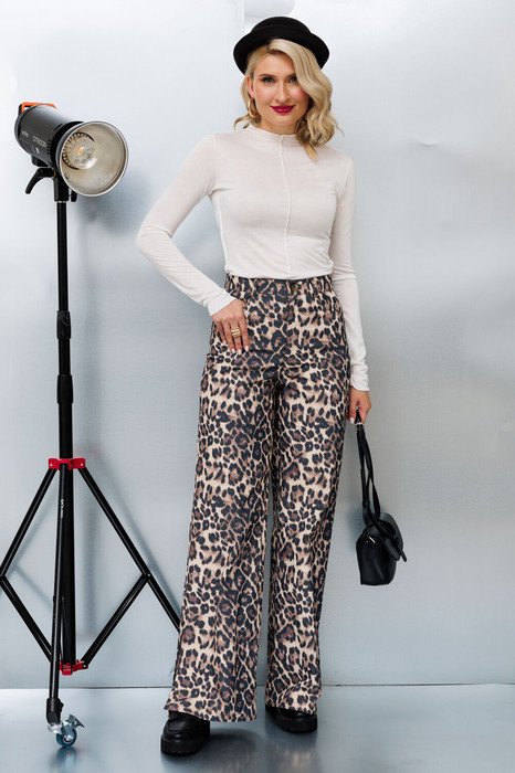 Брюки в леопардовый принт, для тех, кто следит за тенденциями. Застежка по переду на брючную молнию. По заднему полотнищу расположены карманы. Внизу распложены разрезы.