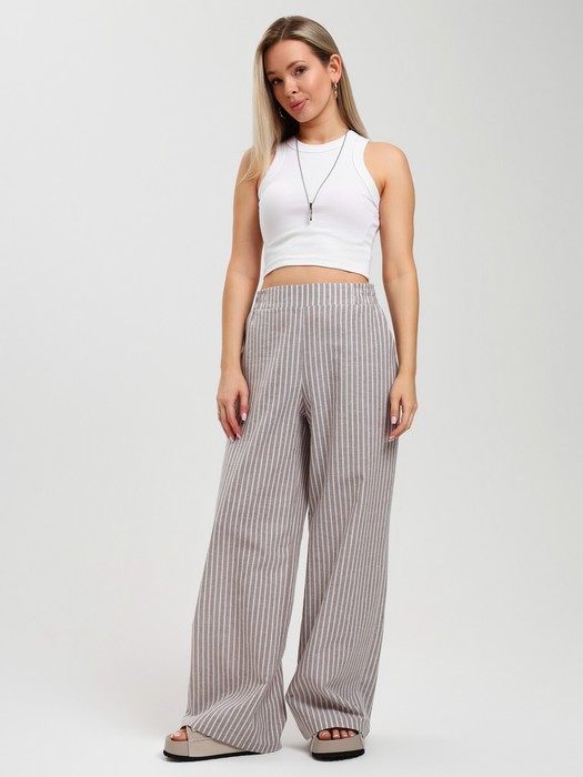 Брюки молодежные из тканого полотна с набивным рисунком в полоску, свободного покроя, с карманами в боковых швах, на притачном поясе с эластичной тесьмой внутри.