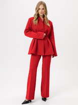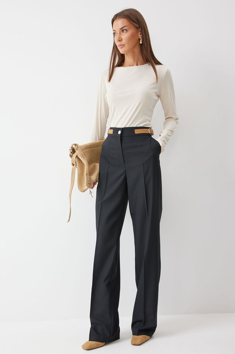 Брюки прямого силуэта из костюмной ткани. По верху брюк притачной пояс с застежкой на петлю и пуговицу, по верху пояса ,на боковых швах , расположены декоративные пряжки. На передних половинках обработаны карманы и застежка молния в среднем шве. На задних половинках вытачки. По поясу задних половинок брюк резинка. Обращаем ваше внимание, что фурнитура может незначительно отличаться от фото