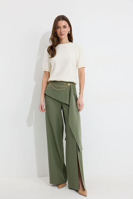 Брюки прямого силуэта из струящейся  ткани. По верху брюк притачной пояс со шлевками для ремня. По переду и спинке декоративная отлетная деталь.  В левом боковом шве потайная молния. По задним половинкам брюк на поясе резинка от вытачки до вытачки. Обращаем ваше внимание, что фурнитура может отличаться от фото. Декоративный пояс в комплект не входит !