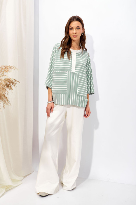 Брюки свободного прямого кроя, расширенные к низу. Выполнены из хлопкового трикотажного полотна молочного цвета. Пояс на резинке, с дополнительной кулисой и шнурком-завязкой. В брюках обработаны боковые карманы с наклонным входом . Обращаем ваше внимание, что фурнитура может отличаться от фото.