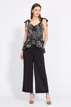 Модные брюки-кюлоты с элегантным запахом, свободной посадки, брючины широкие укороченные, чуть выше щиколотки. По переду молния, сзади по поясу вставлена резинка, запах фиксируется поясом на пряжке. С данными брюками можно смело создавать стильные комбинации с вещами Вашего гардероба. Длина брюк по боковому шву 92 см, шаговому — 62 см. Изделие подойдет на рост 170 см.