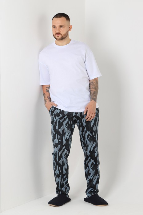 Брюки из полотна с набивным рисунком, классического покроя, прямые, на притачном поясе с эластичной тесьмой внутри, с карманами в боковых швах. Входы в карманы окантованы основным материалом.