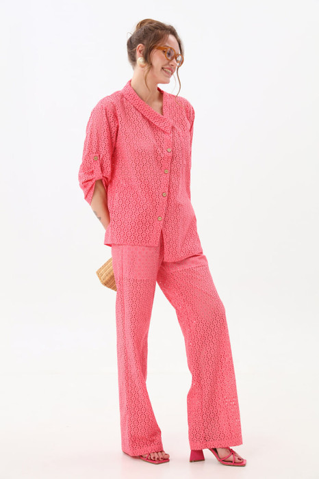 Брюки свободного кроя, верхний срез представлен широкой резинкой, с карманами.