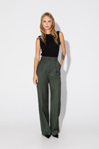 Текстильные брюки-палаццо с высокой посадкой. Детали: высокая посадка, широкие и длинные брюки, притачной пояс со шлевками, передние половины с небольшими застроченными мягкими складками и заутюженными стрелками, застежка на молнию и пуговицу, боковые карманы