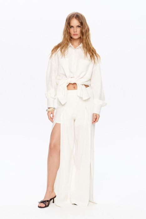 Детали: эластичный пояс, высокие разрезы, без застежки, без карманов, брюки на подкладке из основной ткани.
