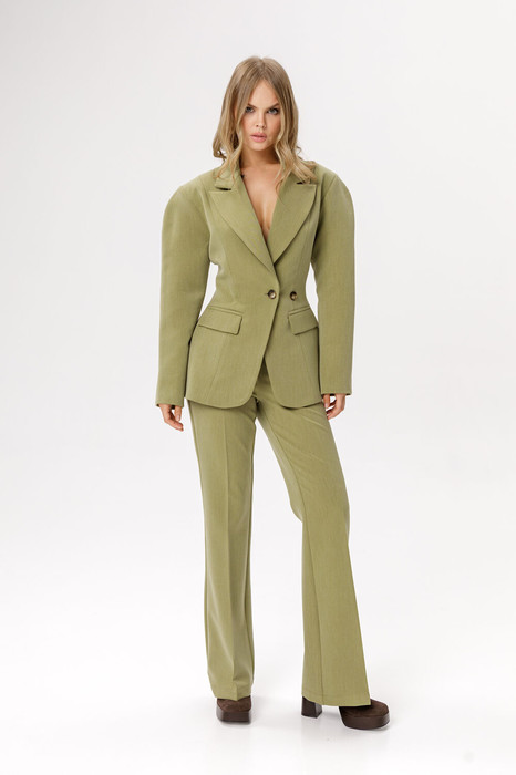 Детали: притачной пояс со шлевками, передние половины с заутюженными стрелками, застежка на молнию и потайные крючки, боковые карманы. Задние части брюк с вытачками и заутюженными стрелками. Пояс брюк без резинки.