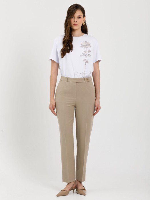Модель зауженная к низу, со стрелками, на подкройном поясе. Пояс со шлёвками и хлястиком. Застёжка на молнию, крючки и пуговицу на поясе. Спереди карманы в подрезных. Сзади прорезной карман в рамку, застёгивающийся на пуговицу.