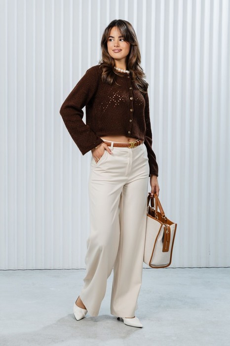 Брюки отлично сочетаются с облегающими топами, блузками или свитерами. Для завершения образа подойдут туфли на каблуке, лодочки или стильные сандалии, как на фото.