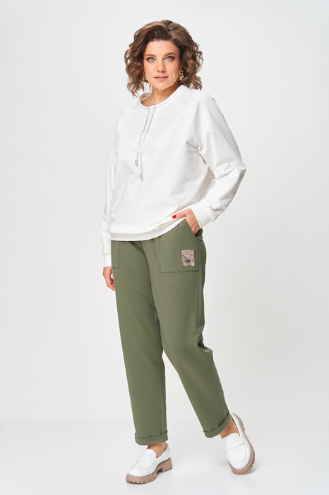 Брюки женские из трикотажной ткани (двунитка), слегка заужены к низу. По переду брюк расположены накладные карманы. На левом кармане настрочной декоративный элемент. В пояс вставлена резинка по кругу.