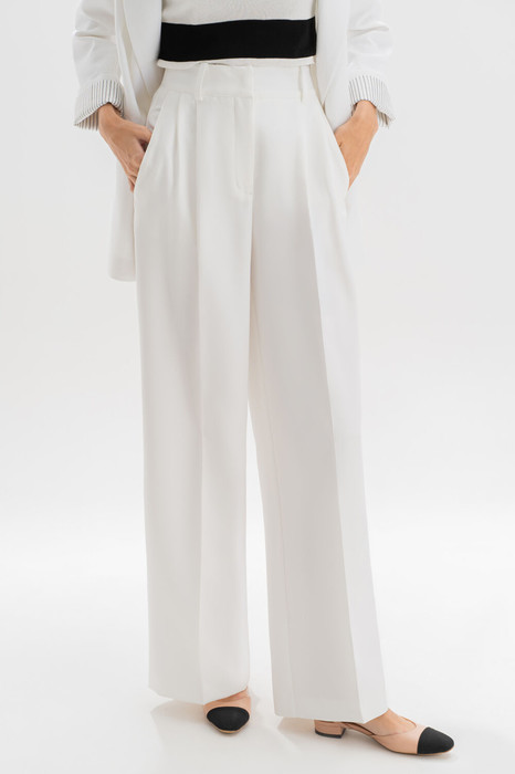 Идеальные белые брюки — основа капсульного гардероба. Модель выполнена в прямом крое, визуально вытягивающем силуэт и придающем образу легкость. Аккуратные стрелки, лаконичные складки от пояса и деликатные вытачки формируют безупречную посадку. Пояс с регулируемыми патами обеспечивает комфортную посадку на талии, а универсальный цвет легко сочетается как с базовыми топами, так и с яркими акцентами. Брюки женские, прямые, выполнены из костюмно-плательной ткани "барби". Передние и частично задние половинки брюк, с отрезным поясом, задние половинки брюк от вытачки до бокового шва с цельнокроеным поясом, с застёжкой на тесьму - «молнию», расположенную в среднем шве передних половинок, Пояс застегивается спереди на один пришивной крючок и 1 петлю и 1 потайную пуговицу. Для регулировки пояса по талии в боковых швах обработаны паты, застегивающиеся на 1 петлю и 2 пуговицы. Передние половинки брюк с боковыми наклонными карманами, частично застроченными от пояса вниз на 3,0 см, с двумя парами односторонних складок от пояса, с 2-мя шлевками. Задние половинки брюк с талиевыми вытачками. Передние и задние половинки брюк с заутюженными стрелками. Средняя длина брюк по боковому шву с поясом   112,0 см (±3,0 см).