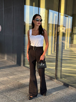 Брюки прямые из струящейся ткани. Верх на поясе со шлевками. По спинке пояс собран на резинку. Застежка по переду на молнию и пуговицу на поясе. В боковых швах карманы.