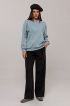 Брюки клёш из джинсовой ткани. Верх на притачном поясе со шлёвками. Высокая посадка. Застёжка спереди на петли и пуговицы-болты. По переду боковые карманы. По задней части кокетка и накладные карманы. Отделка контрастной нитью.