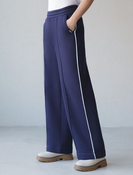 Теплые прямые брюки темно-синего цвета из эластичного футера трехнитки с начесом созданы для максимального комфорта в холодную погоду. Мягкий материал приятный к телу, хорошо держит форму, не вытягивается и не теряет форму даже при активной носке. Благодаря дышащим свойствам премиального футера, брюки подходят на любую погоду, обеспечивая оптимальный микроклимат и уют. Свободный крой и эластичный широкий пояс делает посадку удобной для разных типов фигуры и размеров, включая большие и маленькие. Застроченные стрелки визуально вытягиват силуэт и подчеркивают эстетичнось повседневных брюк, а контрастные тонкие лампасы добавляют актуальности образу. Благодаря особенностям трехниточного плетения и внутреннему слою с начесом, эти брюки отлично сохраняют тепло в холодные осенние и зимние дни, при этом в них вы будете выглядеть модно и современно. Сочетайте в комплекте с худи D49.142.