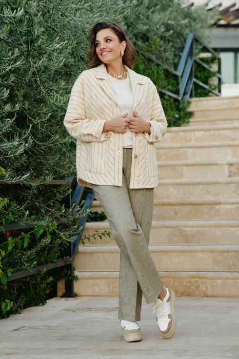 Брюки классического, прямого силуэта это эталон спокойной элегантности и практичности. Цвет «хаки» не кричащий, но выразительный, способен гармонировать с чем угодно, оставаясь идеальным фоном или достойным акцентом в комплекте. Свободный крой дарит комфорт и свободу. Брюки прямые зауженные к низу, с застроченными кантами по переду и застёжкой на тесьму-молнию в гульфике и пуговицу по центру пояса. Пояс притачной по бокам на тесьме-резинка для максимального комфорта по талии. По переду брюк в верхней части джинсовые карманы. На задней части брюк фигурная кокетка. В этой модели брюк чувствуешь себя комфортно, современно и уместно в любой ситуации, где ценится стиль. Это инвестиция в гардероб, которая будет слжить верой и правдой сезон за сезоном. Длина брюк по боковому шву 98 см.