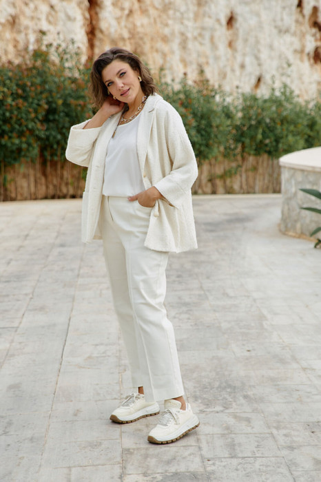 Брюки молочного оттенка — это про лёгкость решений. Они дарят ощущение чистоты и порядка, но без строгости. Это вещь для тех, кто ценит уютную элегантность и хочет выглядеть продуманно, но непринуждённо. Служат основой для минималистичных ансамблей и для более смелых цветовых сочетаний, универсальны — выглядят органично и летом, и в межсезонье. Брюки призаужены к низу, по переду застрочен кант, в брюках прорезные карманы по верхней части, застежка на молнию в гульфике и джинсовую пуговицу по центру пояса. Пояс притачной, на резинке по бокам. На задней части брюк фигурная кокетка и накладные карманы. Длина брюк 98 см.