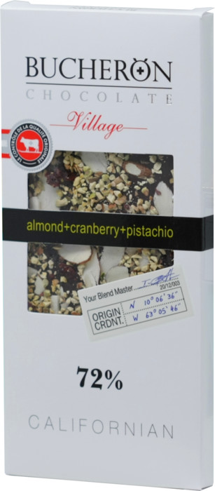 Шоколад горький с миндалем, клюквой и фисташкой.Этот шоколад имеет легкий фруктовый аромат, характерный для какао-бобов Criollo, собранных на побережье Венесуэлы. Сок и ягоды лесной клюквы добавляет свою приятную кислинку и свежесть горькому шоколаду , а фисташки с миндалем делают вкус более многогранным, открывая множество вкусовых оттенков.