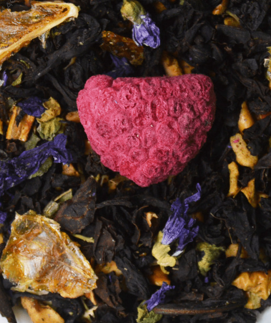 Состав: индийский чай, листья смородины, кусочки сублимированной клубники и ежевики, цедр и сегмент апельсина, лепестки мальвы.  Содержит пищевые ароматические масла.