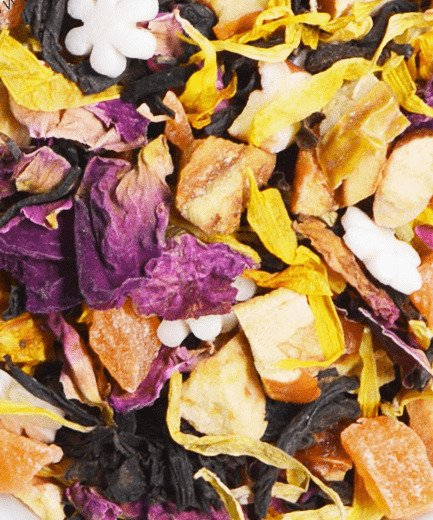 Состав: классический черный индийский чай, цукаты, кусочки сушеного яблока, лепестки розы, календулы, аромамасла