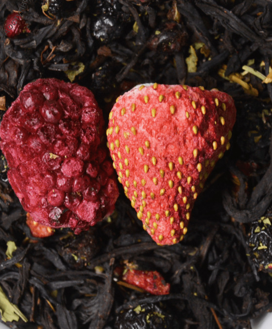 Купаж из классических черных индийских чаев с добавленем листа смородины  и земляники, каркаде, сублимированных ягод черники, клубники и ежевики, вишни. Содержит пищевые ароматичесик масла.
