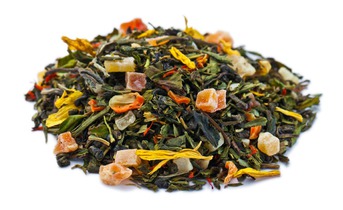 Черный чай с добавлением цедры апельсина, кусочков дыни, лимонной травы, лепестков василька и календулы с ароматом лимона.