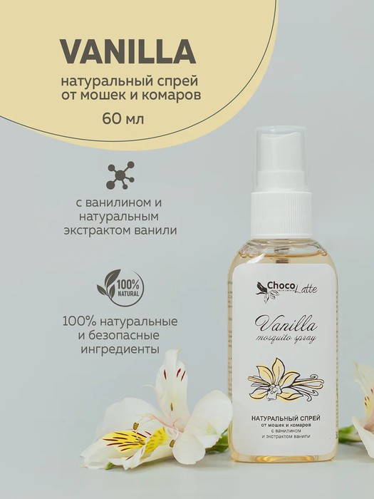 Содержит природные репелленты — ванилин и натуральный экстракт ванили, стойкий и приятный аромат которых эффективно отпугивает мошек и других насекомых.