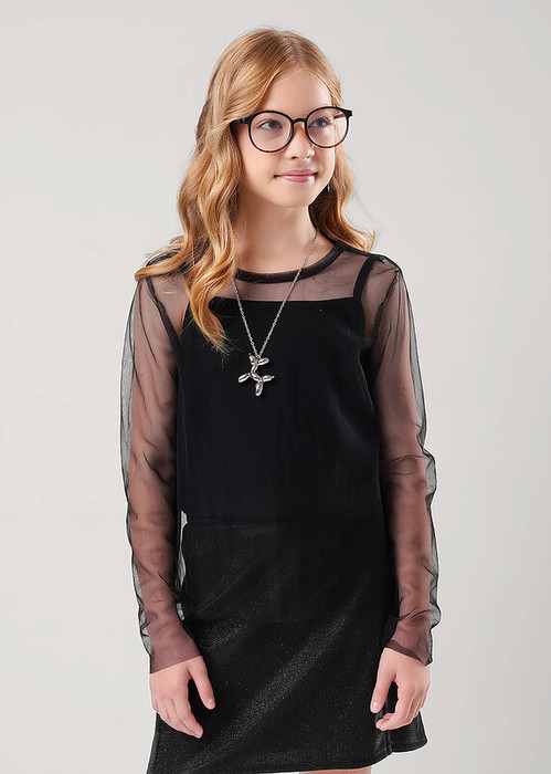 Двухслойный нарядный укороченный лонгслив из сетки. Круглая эластичная горловина. Внутренний слой -майка выполнена из хлопка с эластаном. Прекрасно подойдет как для праздника так и для повседневной носки.