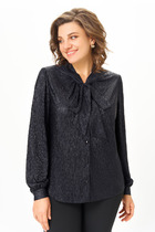 Блузка из вискозного трикотажного полотна пике свободного силуэта. Короткий втачной рукав. По горловине отложной воротник с внутренней обтачкой. Спереди имитация борта с внутренней обтачкой, по низу бант завязка.