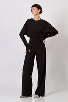 Брюки прямые,широкие из текстильного полотна габардин. Притачной пояс со шлевками, гульфиком и застежкой на молнию, крючок. Боковые карманы с отрезным бочком. По спинке вытачки и карманы листочка,стрелки.