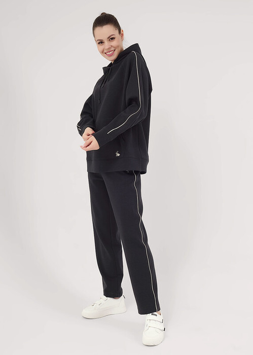 Брюки спортивные из трикотажного полотна, зауженные. Притачной пояс на внутренней резинке. Боковые карманы с отрезным бочком, нашивка. По боковому шву контрастный кант.