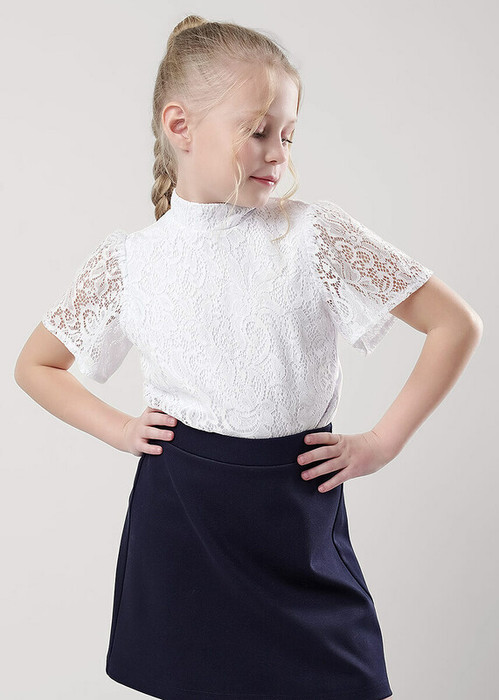 Стильная блузка прекрасно дополнит любой гардероб! Модель со стойкой и рукавами- крылышками выполнена из ажурного кружева. Спинка из хлопкового трикотажа с эластаном.Блузка отлично подойдет для создания классных школьных образов и отличного настроения!