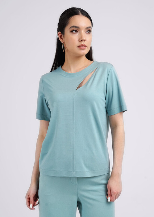 Джемпер из вискозного трикотажного полотна интерлок. Округлая горловина. По горловине внутренняя обтачка. По переду фигурный рез и средний шов. Короткий втачной рукав.