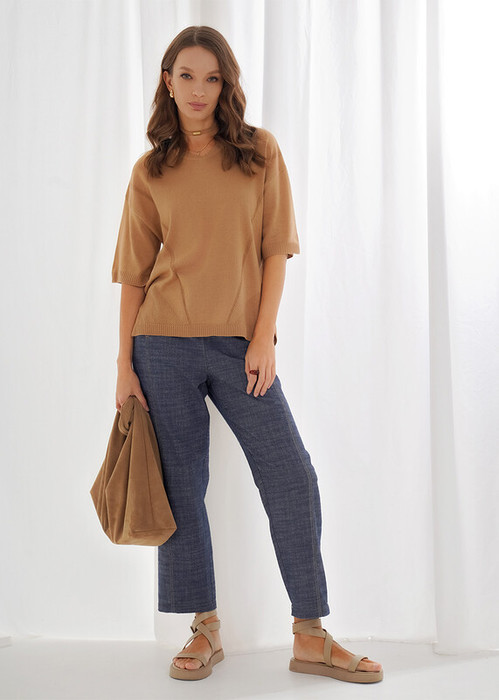 Вязаный джемпер свободного кроя из хлопковой пряжи с добавлением акрила, переплетение гладь. V-образный вырез горловины с бейкой. Короткий рукав со спущенной линией плеча. Боковые разрезы. По низу изделия и рукавов узкие манжеты.