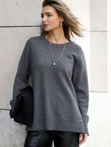 Вязаный джемпер прямого силуэта из вискозной пряжи с добавлением нейлона. Длинный втачной рукав. Основное переплетение гладь. Округлая горловина с бейкой. По низу изделия и рукавов узкие манжеты, нашивка металл.