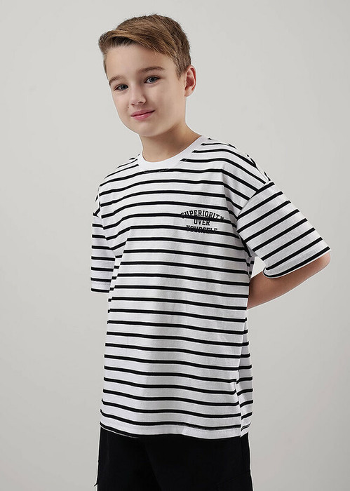 Базовая футболка в полоску из хлопка дополнит образ в любом стиле. Круглый вырез горловины оформлен эластичной окантовкой. Сочетай футболку с любимыми брюками и стильным бомбером или худи и получишь классный образ на каждый день.