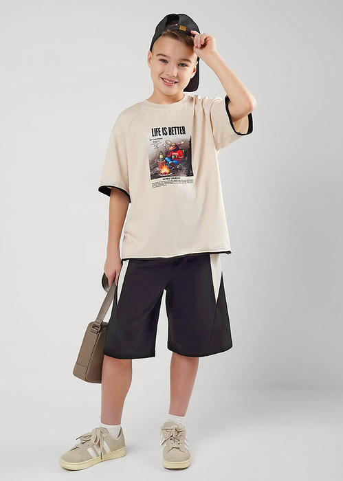 Стильная футболка оверсайз из 100% хлопка для мальчика с эластичной горловиной обеспечивает комфорт. Оригинальный принт на передней части привлекает внимание. Характерной деталью модели являются необработанные двойные края по низу изделия и рукавам.