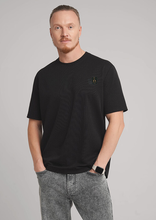 Стильная мужская футболка oversize из трикотажного фактурного полотна. Изделие со спущенной линией плеча, удлиненным рукавом, дополнено дизайнерской вышивкой. Модель создана для тех, кто ценит комфорт.