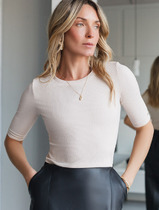 Футболка из плотного эластичного хлопкового полотна. Короткий втачной рукав. Округлая горловина с обтачкой из рибаны.