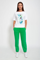 Джемпер из хлопкового трикотажного полотна. Короткий спущенный рукав. Круглый вырез горловины обработан рибаной. По спинке средний шов и пояс на резинке. По переду термонаклейка.