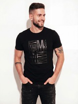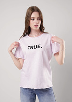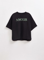 Футболка из хлопкового трикотажного полотна. Короткий спущенный рукав. Округлый вырез горловины с обтачкой из рибаны. По переду принт.