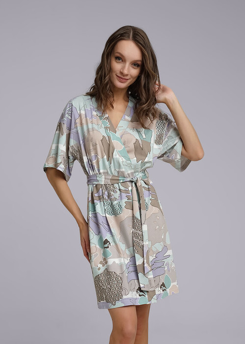Халат для дома на запах с поясом из хлопкового трикотажного полотна. Короткий спущенный рукав.