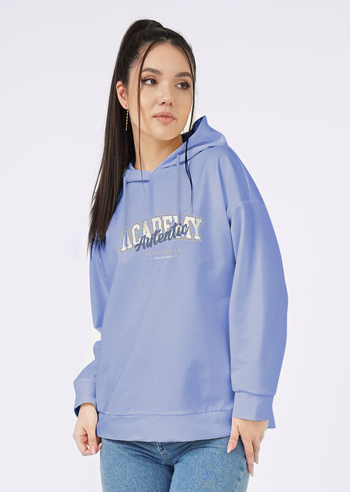 Толстовка из футера 2-х нитки умеренного объема. Спущенный рукав. По горловине капюшон со шнуром,по низу рукава и изделия притачные манжеты, завершает дизайн на детали переда принт.
