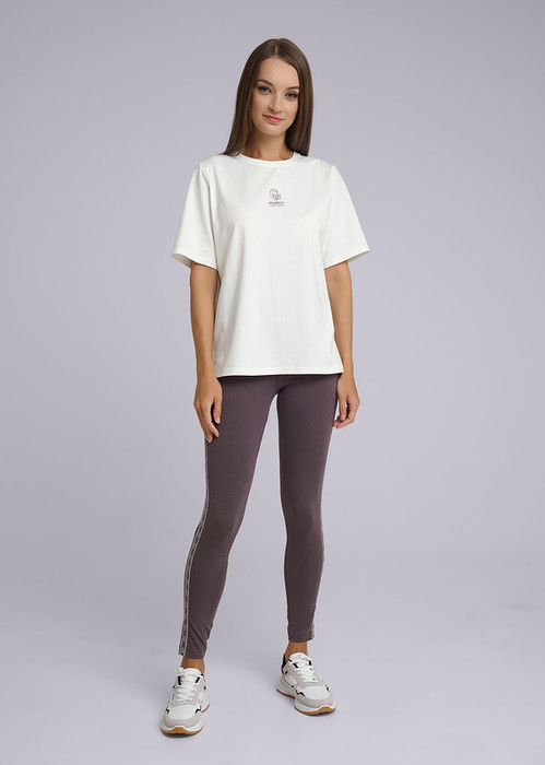 Лосины из плотного эластичного хлопкового полотна. Широкий отрезной пояс на внутренней резинке с принтом. По бокам лампасы из декоративной тесьмы.