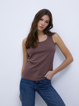Майка из трикотажного полотна - рибана. Умеренный объем. Широкая бретель,округлая горловина. По пройме и горловине окантовка.