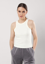 Майка-борцовка из хлопкового трикотажного полотна кашкорсе. Умеренный объем. Узкая бретель, округлая горловина. По горловине и пройме окантовка.