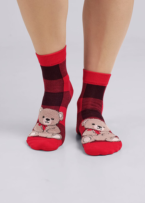 новогодние женские носки в клетку с рисенком мишка из пряжи травка
