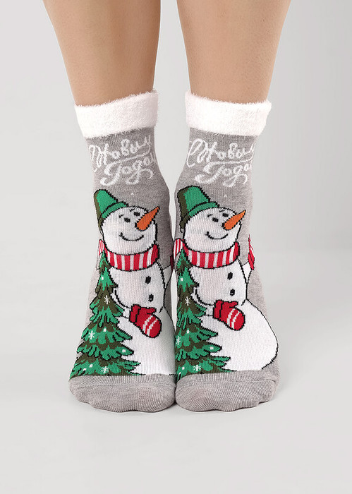 женские носки с рисунком снеговика, надписью с новым годом, борт выполнен из пряжи травка