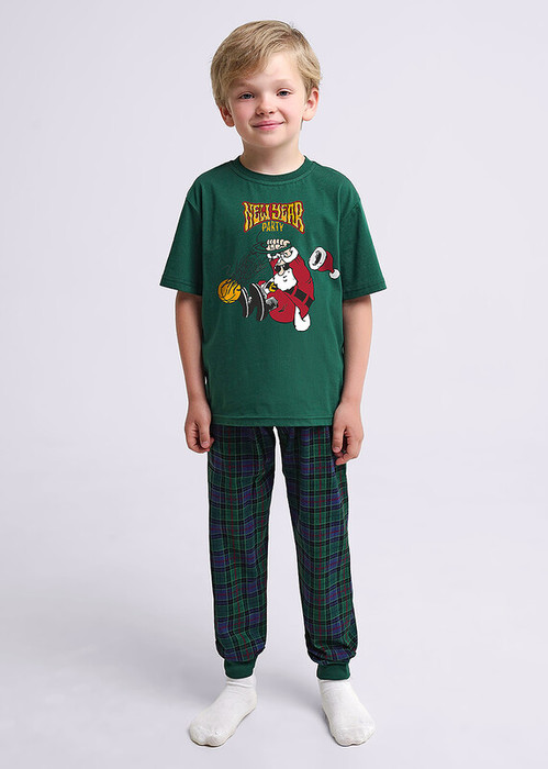 Новогодняя хлопковая пижама для мальчика, состоящая из футболки и брюк. Футболка свободного кроя дополнена оригинальным принтом спереди. Брюки умеренного объёма с эластичным удобным поясом, выполнены из хлопкового полотна в стильную клетку.