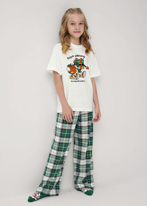 Новогодняя пижама для подростков,состоящая из футболки и брюк. Футболка свободного кроя спереди украшена милым тематическим принтом. Брюки прямые среднего объема с эластичным поясом.