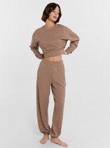 Пижама для дома из хлопкового трикотажного полотна с карбоном. Джемпер с длинным втачным рукавом. Застёжка на пуговицы, воротник с лацканами. По переду накладной карман, нашивка. Боковые разрезы. Брюки прямые, цельнокроенный пояс на внутренней резинке.